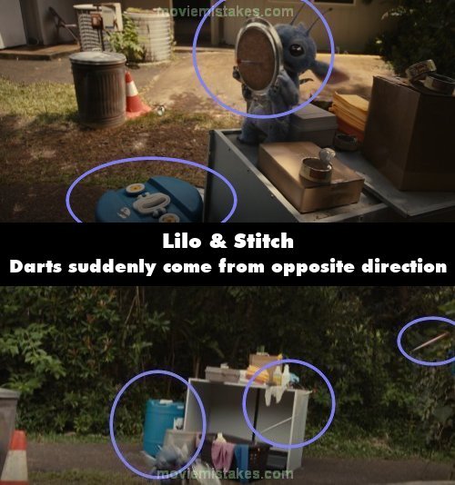 Continuity mistake: When Jumba fires the darts at Stitch, he's standing beside the blue water tank. When Stitch jumps to avoid them, the darts suddenly come from the opposite direction to where the tank is.