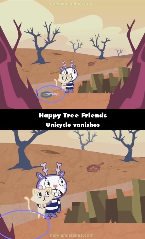 Continuity mistake: Who's to Flame?: At the end, Mime gets off his unicycle, and it falls to the ground next to him. Two shots later, the unicycle is gone. (00:21:10)
