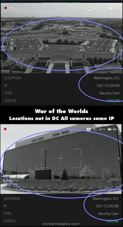Factual error: Right towards the start, Will opens up the camera feed around several locations in Washington DC and in the surrounding areas. Six camera feeds pop up, but the information on them is all lazy copy-paste. They all say Location: Washington DC. Yet the first camera shows the Pentagon, which is in Arlington VA, not Washington DC. Then the sixth camera shows the NSA Headquarters, which is in Fort Meade, Maryland, not DC. Also, all six cameras have the same IP address. Not possible with how it's set up.