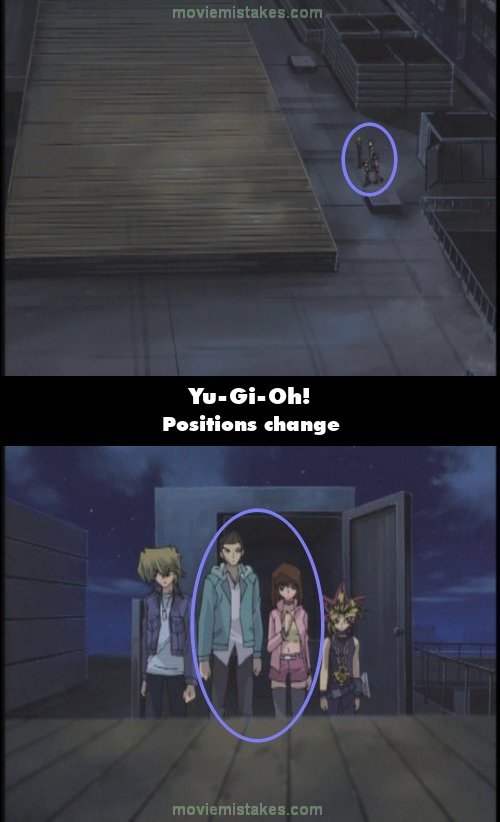 Continuity mistake: When the main characters walk onto the rooftop, in the wide shot, Tea is behind Yugi and is aligned with him, and Tristan is behind Joey and is aligned with him. In the next shot, Tea and Tristan are still behind, but not aligned with Yugi and Joey. (00:12:23)