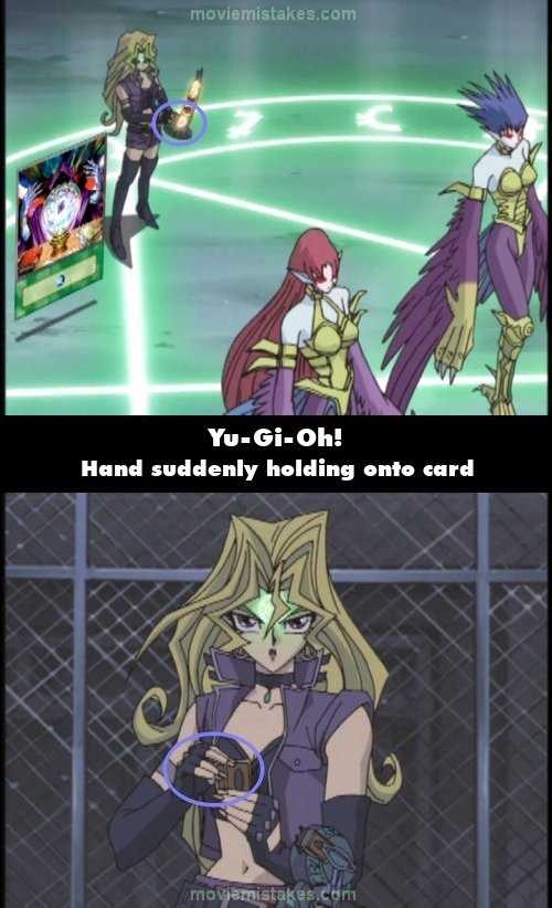 Continuity mistake: When Mai activates the Spell Reproduction spell card, she is shown inserting the card into the duel disk with her right hand. Also, her left hand is pointed to the right. In the next shot, her right hand is now away from the duel disk and is now holding onto a card in her left hand (which is now raised). (00:14:10)