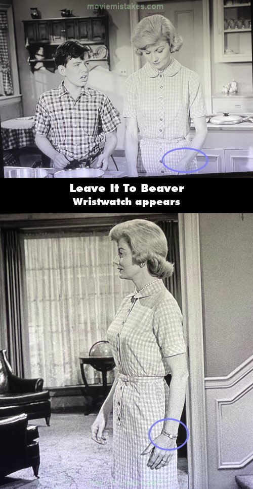 Continuity mistake: June is washing the dishes, and she doesn't have her wristwatch on. She hears Ward and Wally come home, and she goes to greet them. When she is shown again after walking from the kitchen to the foyer, she has her wristwatch on. (00:18:12 - 04:59:12)