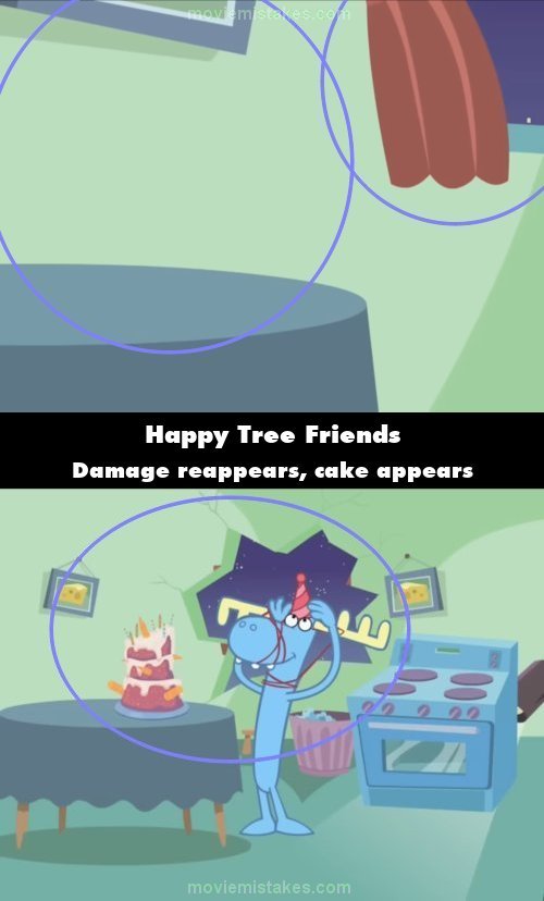 Continuity mistake: Hear Today, Gone Tomorrow: When Flippy swings the spiked log into Lumpy's trailer, it puts a huge hole in the wall where the window was. Then, when Lumpy picks up the party hat, the wall is intact with the window still there; then it reverts in the next shot. Additionally, the cake suddenly appears on the table when Lumpy puts on the party hat. (00:06:09)