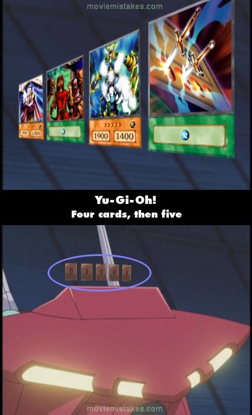 Continuity mistake: On the DuelTek's first turn, it has four cards in its hand. Then there is a close-up of the cards in its "hand", where there are only three cards visible, and then it draws a fourth card. In the shot after that, there are now five cards in its hand. (00:04:03)