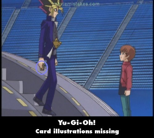 Revealing mistake: When Yugi and Rick walk down the steps of the duelling platform after the duel has finished, Yugi is holding onto Rick's deck before handing it back to him. In this shot, the front side of one of Rick's cards can be seen, and it is missing the illustrations. (00:12:20)