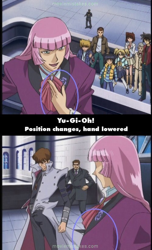 Continuity mistake: When Zigfried tells Kaiba to do what he thinks is right, he is standing in a position where he is facing Kaiba and has his left hand on his chest. When the shot cuts, he is standing with Kaiba positioned to the side of him, and his hand is lowered. (00:14:57)