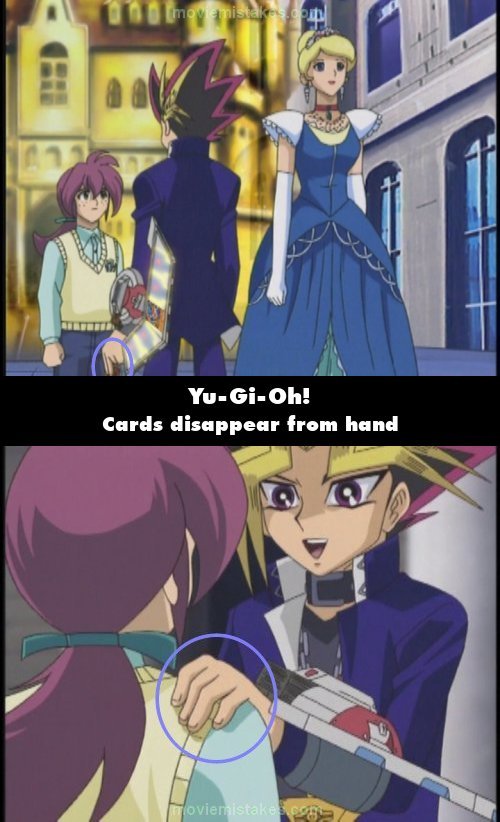 Continuity mistake: When Yugi walks over to Leon, he has two cards in his left hand. He then places his left hand on Leon's shoulder, and the cards in his hand have disappeared. (00:02:39)