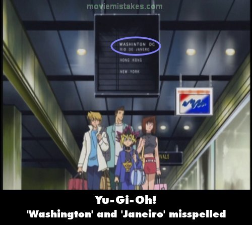 Character mistake: When the main characters are walking through the airport, there is a screen with the locations of different airports above them. One location listed is Washington DC, but it is missing a G, misspelling it as "Washinton DC." Also, listed below is Rio de Janeiro, but it is missing the second I, misspelling it as "Rio de Janero." (00:02:00)
