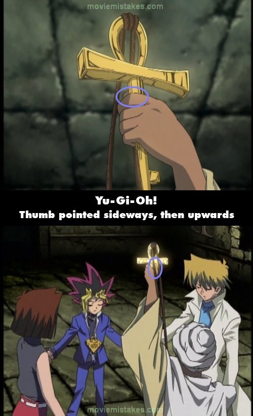 Continuity mistake: When Shadi says, "Please guide us through the mysterious labyrinth of the Millennium Puzzle," he raises his Millennium Key. In the close-up of the Millennium Key, his thumb is pointed sideways, but when the shot cuts, his thumb is pointed upwards. (00:04:34)