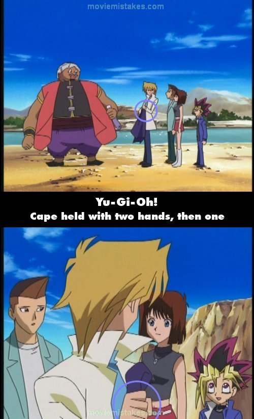 Continuity mistake: When Joey is holding onto the Pharaoh's cape after taking it off Bobasa's back, while Yugi is saying, "The important thing is, we found something of the Pharaoh's," Joey is holding the cape with two hands. When the shot cuts, Joey is holding the cape with one hand. (00:12:25)