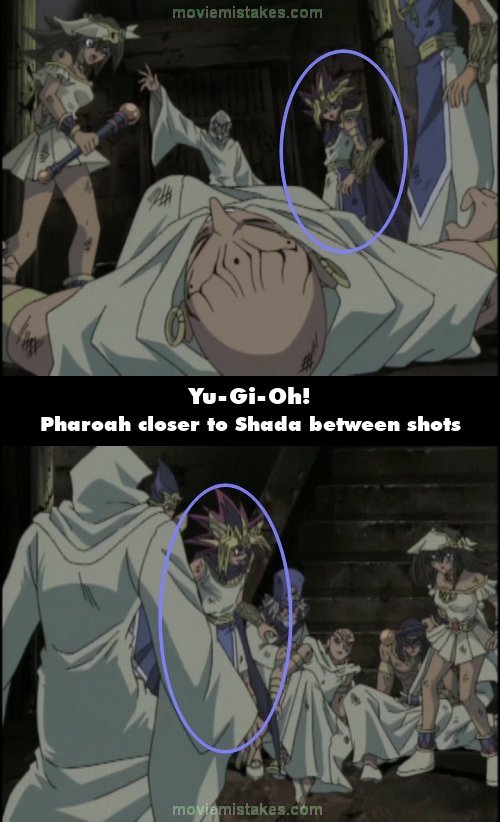 Continuity mistake: When Aknadin pushes Shada to the floor, he lands a fair distance away from the Pharaoh. But in the next shot, the Pharaoh is much closer to him. Also, Mana is looking at Shada when he lands on the floor, but is looking at Aknadin when the shot cuts. (00:06:30)
