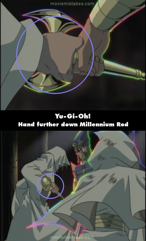Continuity mistake: When Aknadin takes the Millennium Rod off Seto, in the close-up of him removing the rod from Seto's hand, he grabs it by the round Millennium piece on top of the rod. When the shot cuts, his hand is further down and is holding it by the rod. (00:07:33)
