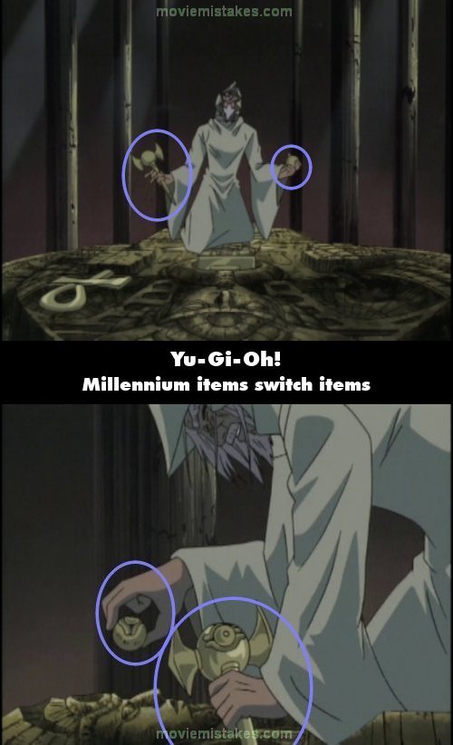 Continuity mistake: When Aknadin walks up to the Millennium Stone, he is holding the Millennium Eye in his left hand and the Millennium Rod in his right hand. When he goes to insert the items into the seals, the Millennium Eye is in his right hand and the Millennium Rod is in his left hand. (00:08:10)
