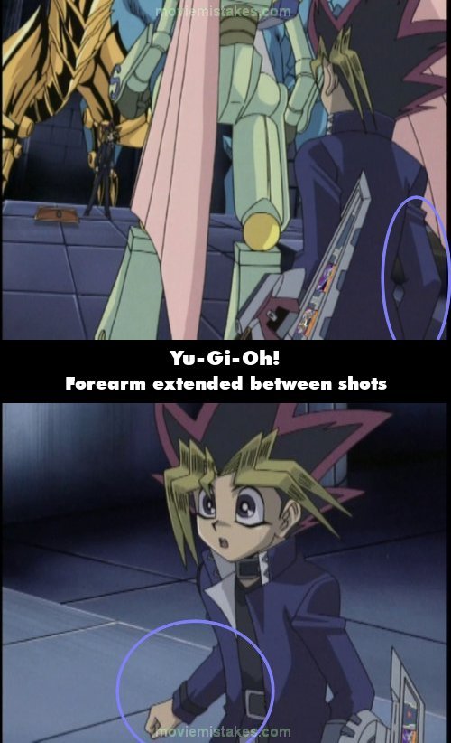 Continuity mistake: After Yugi has activated Mirage Ruler, Pharaoh says, "I have no choice but to end my turn now." When he says this, Yugi's right arm is at his side. When the shot cuts to focus on him, his right forearm is extended. (00:14:07)