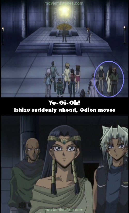 Continuity mistake: When Tea asks, "So this is it?", Marik and Ishizu are standing side by side, and Odion is standing directly behind Ishizu. The shot then cuts to Ishizu saying, "The time has arrived," where Odion is behind Ishizu, but now to her right, and Ishizu is now ahead of Marik. (00:17:02)