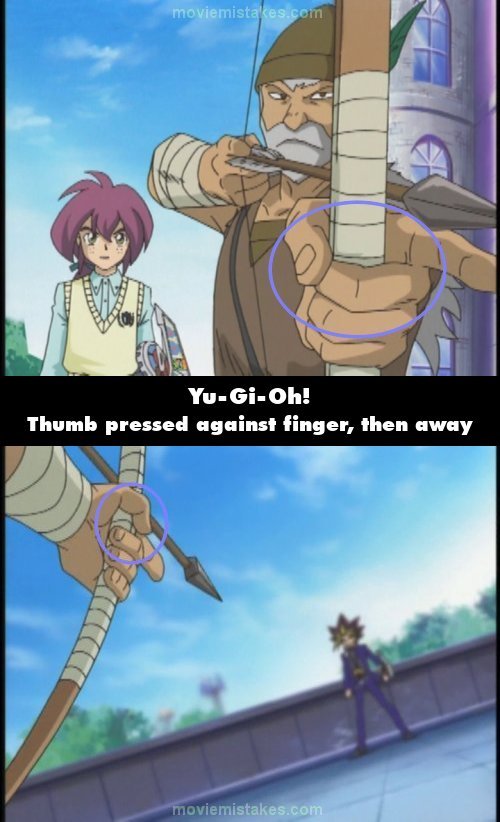 Continuity mistake: When Leon tells his Forest Hunter to attack Yugi's life points directly, he has his left hand placed on the bow while he prepares to fire the arrow. He has his thumb pressed against his middle finger, but when the shot cuts, his thumb is away from his middle finger. (00:02:59)