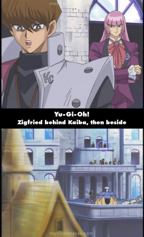 Continuity mistake: When Kaiba asks Zigfried where Leon got the Golden Castle of Stromberg card, Zigfried is standing behind Kaiba. Then there is a wide shot of the balcony from afar where Zigfried is standing beside Kaiba. (00:13:20)