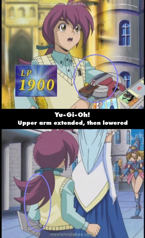 Continuity mistake: When Dark Magician Girl destroys the wolf monster, Leon's life points go down to 1900. His left upper arm is extended in front of him when this happens, but when the shot cuts, his left upper arm is at his side. (00:07:24)