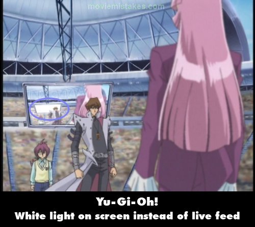 Revealing mistake: A live feed of the duel between Kaiba and Zigfried is displayed on screens in the arena that are positioned behind them. Whenever the screens are shown, another version of the same screen can be seen displayed on the feed. However, the same live feed cannot be seen. Instead, a white light is displayed on the screen and not another version of the live feed.
