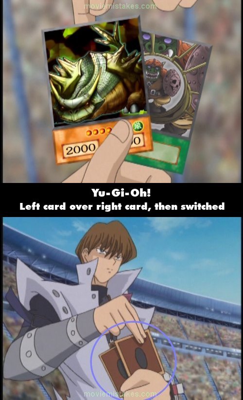 Continuity mistake: Zigfried activates the effect of Nibelung's Ring, meaning Kaiba has to send the Cave Dragon monster card in his hand to the graveyard. In the close-up shot of the two cards in his hand, the card on the left is placed over the card on the right. When the shot cuts, the card on the right is placed over the card on the left. (00:07:58)