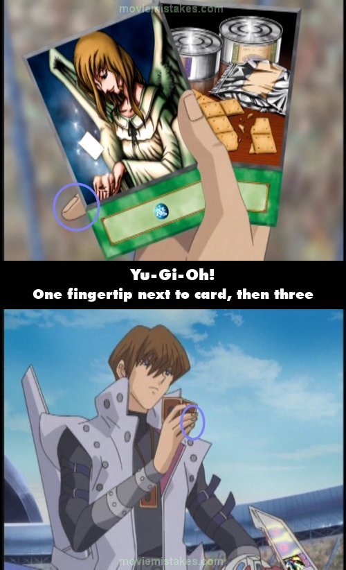 Continuity mistake: When Kaiba draws Graceful Charity and Emergency Provisions from his deck, in the close-up shot of the cards in his hand, the tip of one of his fingers can be seen next to the left-hand side of the Graceful Charity card. In the next shot, the fingertips of three of his fingers can be seen next to the left-hand side of the card. (00:13:30)