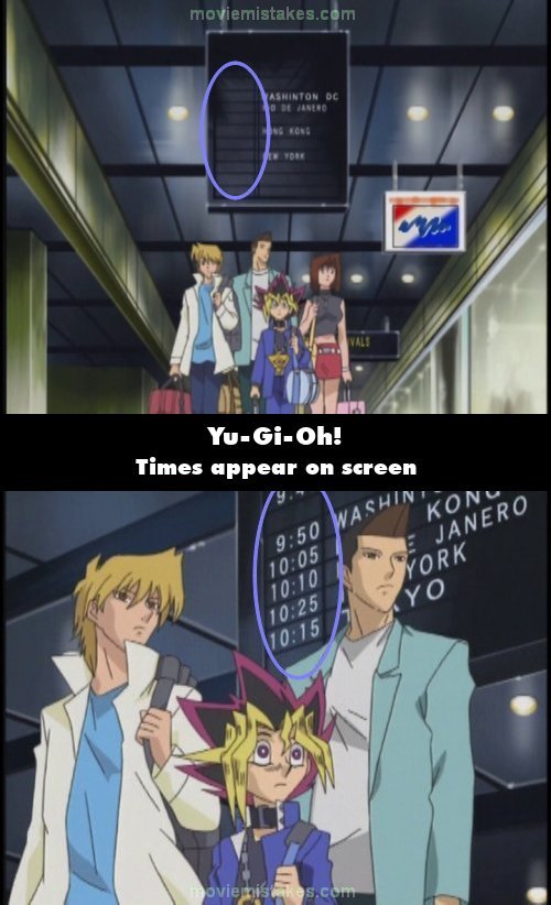 Continuity mistake: At the airport, there is a screen displaying locations where flights will be headed. Seconds later, when Tea runs back to the others after shopping, times have suddenly appeared next to the flight locations on the screen. The times disappear again when they see Marik. (00:02:01)