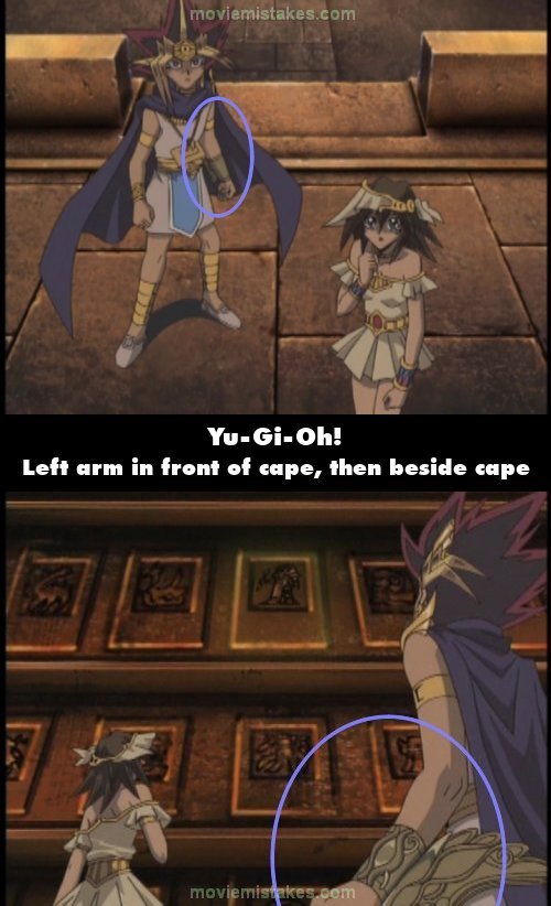 Continuity mistake: When the Pharaoh and Mana notice the carving of the Illusion Magician glowing, Pharaoh's left arm is positioned in front of his cape. When the shot cuts, his left arm is positioned beside the cape. (00:08:35)