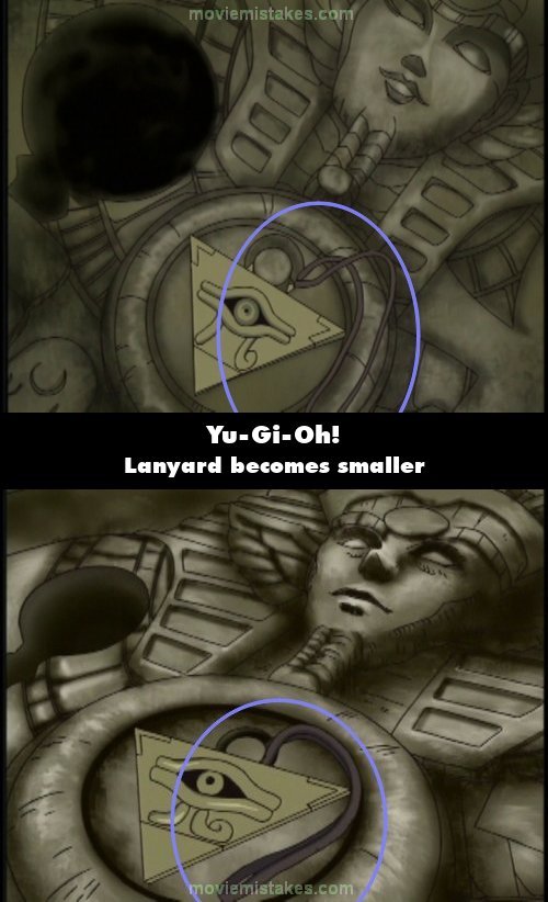 Continuity mistake: When Bakura inserts the Millennium Puzzle into the Millennium Stone, there is a lanyard that is tied around it. Later in the scene, when Bakura stomps on the Millennium Puzzle, the lanyard tied around it is smaller. (00:07:28 - 00:08:52)
