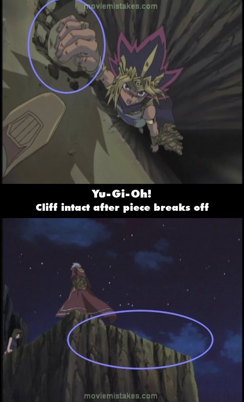 Continuity mistake: When Pharoah is hanging over the edge of the cliff, Bakura stomps over the area that Pharoah is holding onto, causing a piece of ground to break off and Pharoah falls into the chasm. A few seconds later, when the others run up to the edge of the cliff, the piece of ground that broke off can no longer be seen and the edge of the cliff is intact. (00:12:45)