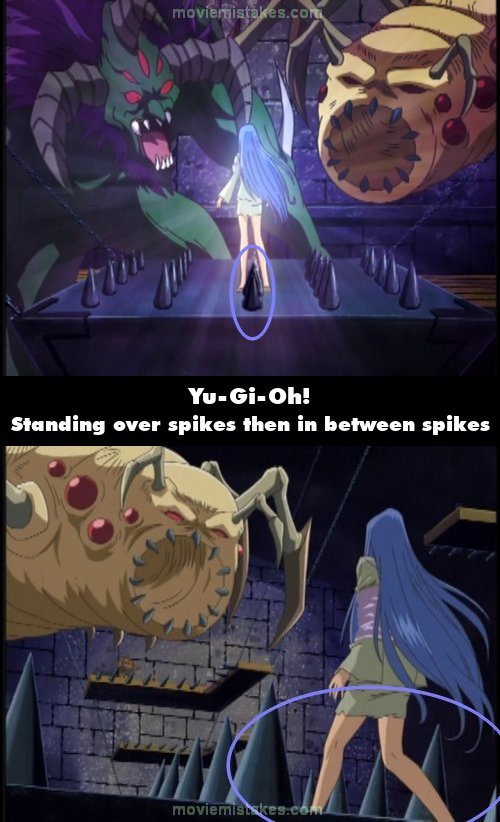 Continuity mistake: When the girl begins glowing, she is standing directly over one of the spikes on the floor beneath her. A few seconds later, when the insect-like creature ties her up, she is standing in between the spikes. (00:02:45)