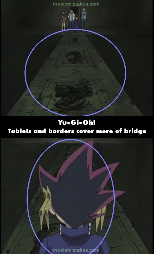 Continuity mistake: When the main characters are standing on the bridge that Yugi says must be "the final test", there are stone tablets on the bridge, as well as two square borders around the tablets. In the next shot, the tablets and borders are much larger and cover more of the bridge. (00:19:18)