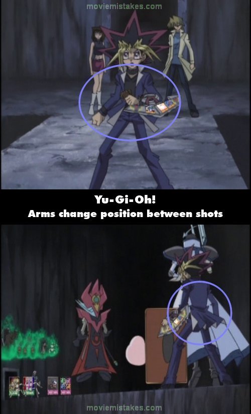 Continuity mistake: When Yugi's life points go from 1000 up to 3200, his left forearm is raised and his right forearm is extended slightly. When the shot cuts, his left forearm is lowered and his right forearm is pointed downwards. (00:15:10)