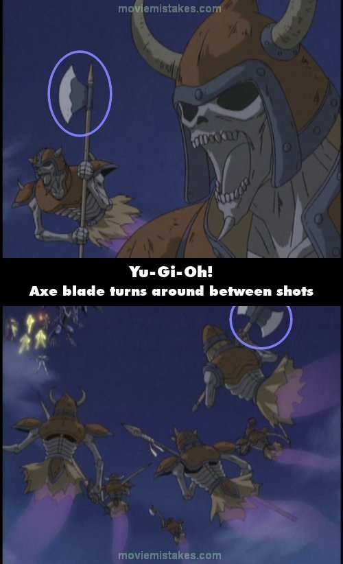Continuity mistake: When the skeleton soldiers advance towards the main characters after reappearing, one of them is holding an axe. The axe blade is facing towards the main characters when it reappears, but when the shot cuts, the axe blade has turned around and is facing away from the main characters. (00:06:05)