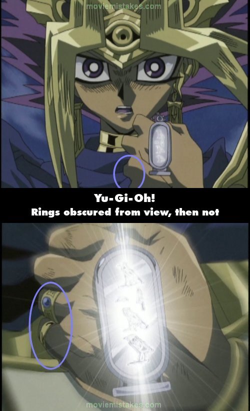 Continuity mistake: When the Pharaoh realises his name has appeared on the cartouche, he has two rings on his fingers. Then during the same shot, when he says "Yugi, it worked," he curls the two fingers he is wearing his rings on even further, obscuring them from view. The rings are shown in view again in the close-up of the cartouche. (00:12:55)