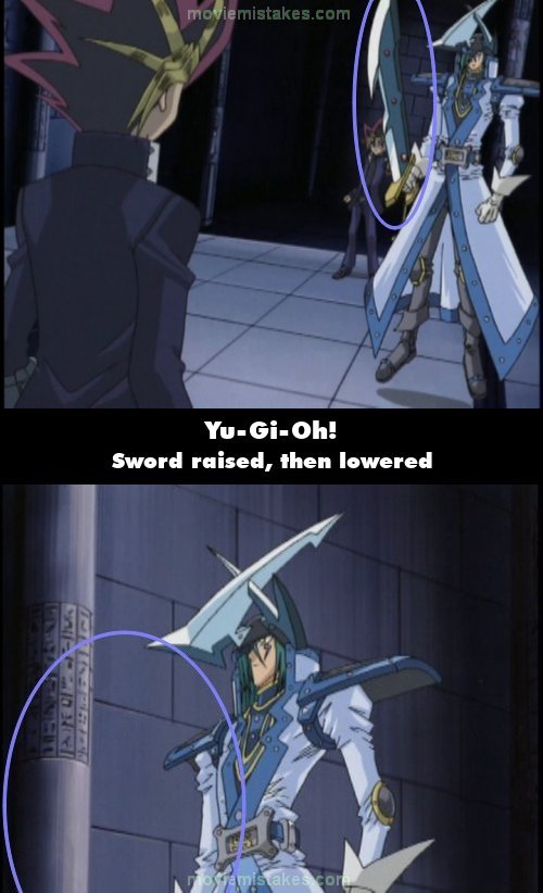 Continuity mistake: Just before Silent Swordsman goes from Level 3 to Level 4, in the shot of Yugi saying "Since it's my turn, my Swordsman moves up in the world," the Swordsman's sword is raised. The next shot shows the Swordsman changing from Level 3 to Level 4, and the sword is no longer raised. (00:09:05)