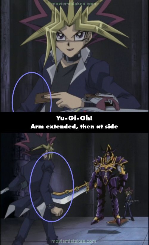 Continuity mistake: When the Pharaoh asks Yugi, "What's wrong? Trying to guess what monster I've brought back?", his right arm is extended slightly. When the shot cuts, his right arm is at his side. (00:09:40)