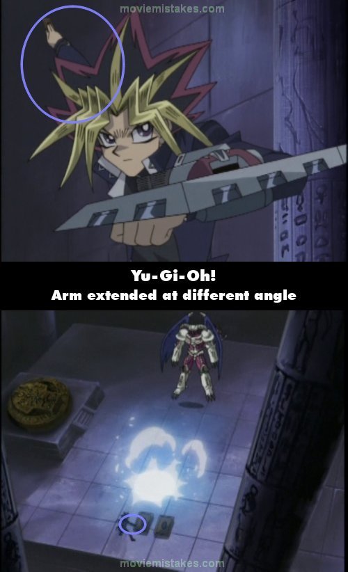 Continuity mistake: When Pharoah draws the Big Shield Gardna monster card from his deck, he draws the card with his right hand and then extends his right arm so that it is behind him. When the shot cuts, his right arm is extended to his right. (00:14:55)