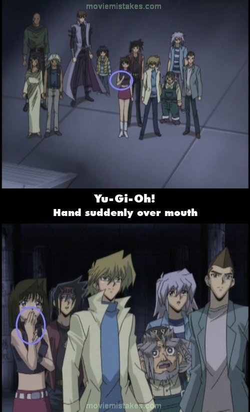 Continuity mistake: After Yugi sends Slifer the Sky Dragon back to the graveyard, in the shot where Mokuba says "He just defeated Slifer for the second time," Tea has her right hand raised to her chest. But in the next shot, her right hand is over her mouth. (00:14:03)