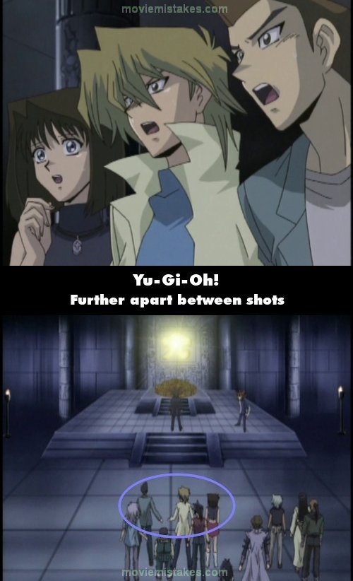 Continuity mistake: When the Pharaoh begins to approach the glowing Millennium symbol on the wall, there is a shot of Joey, Tea, and Tristan gaping. The three of them are all standing next to each other when they do this, but when the shot cuts, there is a two-foot gap between Joey and Tristan and a one-foot gap between Joey and Tea. (00:17:00)