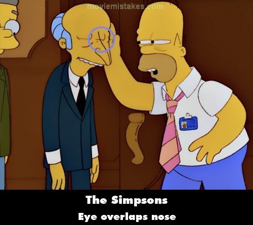 Other mistake: When Homer gets a promotion from Mr. Burns, the latter's left eye is drawn such that it overlaps his nose. (00:11:30)