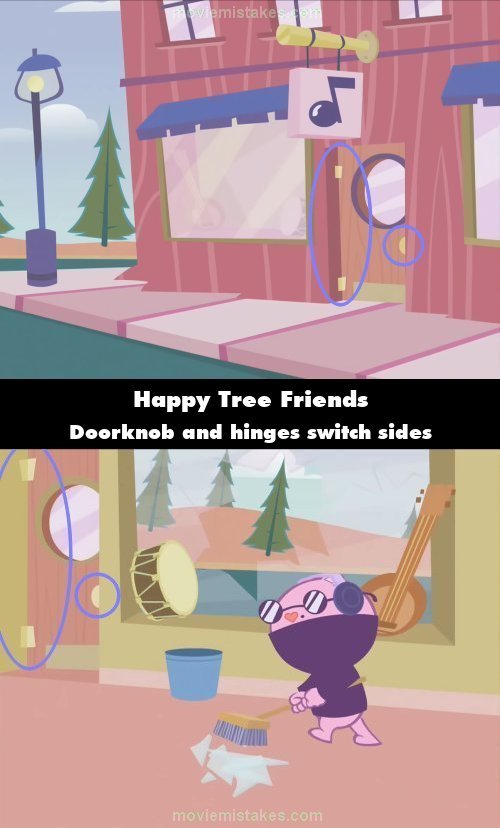 Continuity mistake: Autopsy Turvy: When Flippy and Evil Flippy fly into the window of the music store, the door to the music store has its doorknob on the right side and its hinges on the left. A moment later, when the Mole is shown sweeping glass on the floor, the doorknob and hinges are now on the opposite sides. (00:18:03)