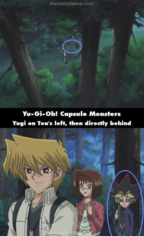 Continuity mistake: When the main characters are walking through the jungle, in the establishing wide shot, Yugi is walking behind Tea on her left. When the shot cuts to a closer angle, Yugi is directly behind Tea. (00:07:50)
