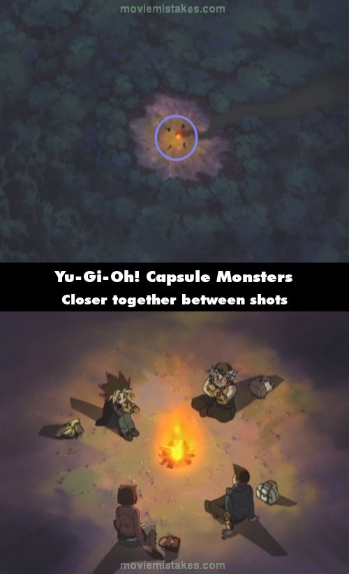 Continuity mistake: When Joey flies over the camp fire while riding Baby Dragon, the wide shot shows Yugi, Tea, Tristan, and Solomon a fair distance from each other. Then, in a closer shot, they are much closer together. (00:03:49)