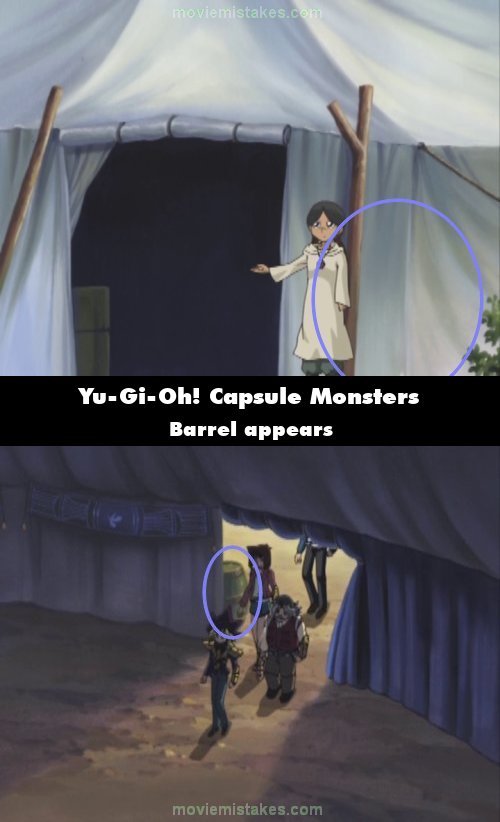 Continuity mistake: When the main characters walk into the tent, in the first interior shot, there is a barrel outside the entrance to the tent that wasn't visible in the previous exterior shot. (00:04:18)
