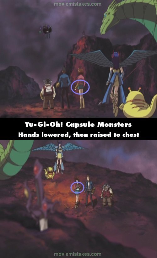 Continuity mistake: When Tea, Tristan, and Solomon are watching Yugi and Joey fight, in the shot where Tea says, "If we defeat Joey, he could be trapped in this place forever," her arms are at her side. But in the next shot, her hands are raised to her chest. (00:14:04)