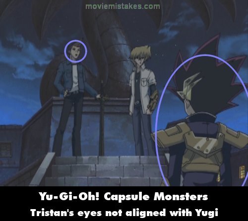 Revealing mistake: After Joey and Tristan fail to remove the sword, Tristan asks Yugi to remove it instead. While he is asking, "Yugi, why don't you give it a go?", his eyes don't appear to be aligned with where Yugi is standing. Yugi is standing at the bottom of the stairs in front of Tristan, but Tristan is looking to the left. (00:10:35)