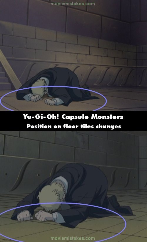 Continuity mistake: When Alexander the Great enters Dr Brisbane's body, Dr Brisbane is kneeling on the floor. His hands are positioned halfway along the floor tile. The shot cuts to Yugi asking Brisbane if he is feeling OK, but when the shot cuts back, his hands are placed directly on the lining of the floor tiles. The floor tiles also appear to have gotten smaller in between the two shots. (00:17:35)