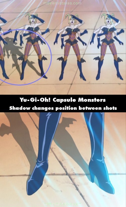 Continuity mistake: Tea uses her Dark Witch monster to see which of the demons casts a shadow. When it's revealed who casts a shadow, the shadow is positioned behind the woman at an angle to the left. But in a close-up of the shadow, it is directly behind the woman, with no rotation. (00:10:54)