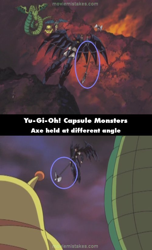 Continuity mistake: When Joey flies down towards Tea, Tristan, and Solomon after Tristan says they need to pull out the sword before it sinks into the volcano, he is holding an axe at an upward angle. Joey then says, "Not on my watch, Tristan," and the axe is pointed downwards. (00:15:24)