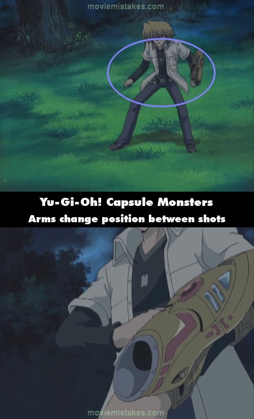 Continuity mistake: When the dragon appears in front of Joey, he says, "Well, here goes," and prepares to load the duel disk. His arms are extended away from his body when he says this, but when it cuts to him inserting the capsule, his left forearm is now extended forwards. (00:12:46)